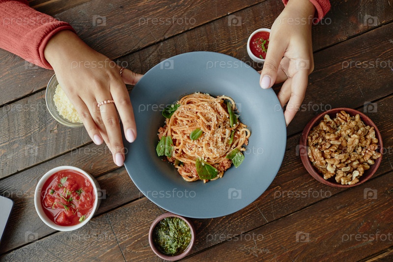 Молодая женщина устраивает тарелку спагетти-пасты для фотосъемки еды