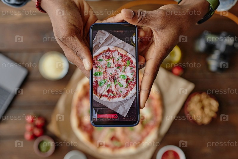 Фотографирование свежей пиццы со смартфоном в студийной обстановке Man