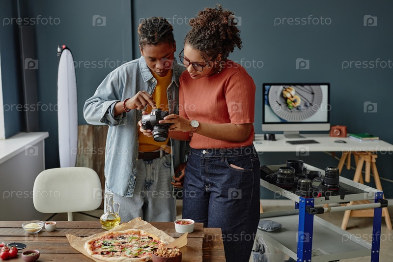 Молодая взрослая чёрная женщина и черный мужчина просматривают настройки камеры во время съемок еды