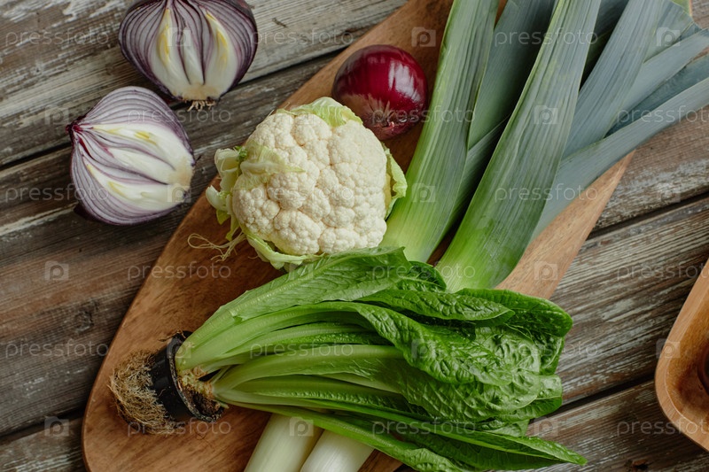 Свежая капуста из лиса, романовая салата и красный лук расположены на деревянном столе