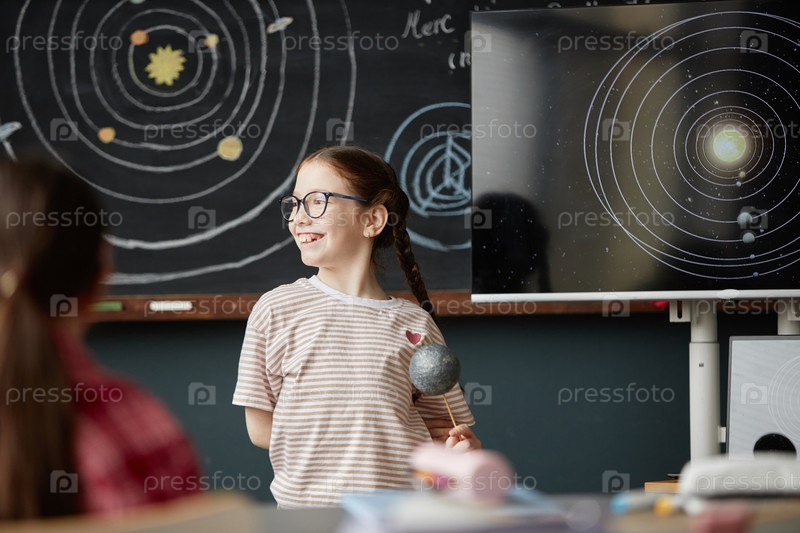 Девочка улыбается, пока представляет модель Солнечной системы в классе