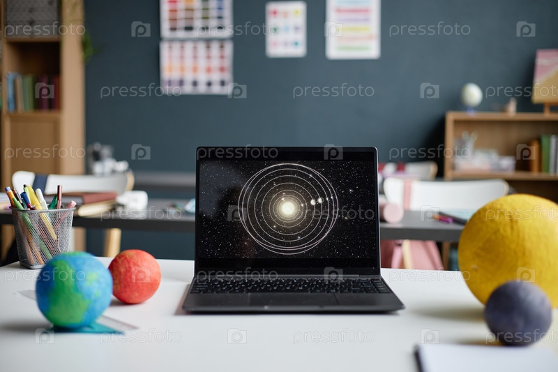 Ноутбук, отображающий диаграмму Солнечной системы в окружении моделей планет в классе