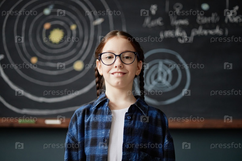 Портрет улыбающейся девочки в классе с диаграммой Солнечной системы