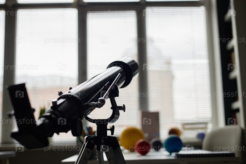 Астрономический телескоп, стоящий в помещении возле окна в научном классе