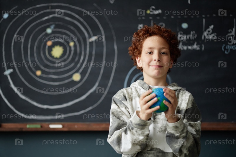 Портрет мальчика, держащего модель планеты, стоящей перед доской