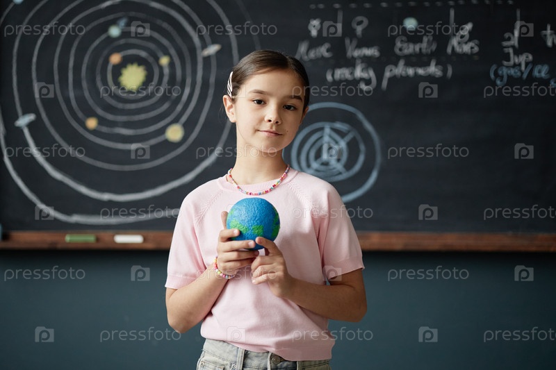 Портрет молодой девушки, держащей модель Глобуса в классной обстановке
