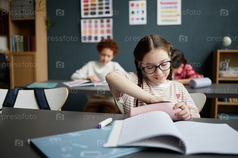 Ученица сидит за столом, готовя канцелярские принадлежности перед уроком в классе