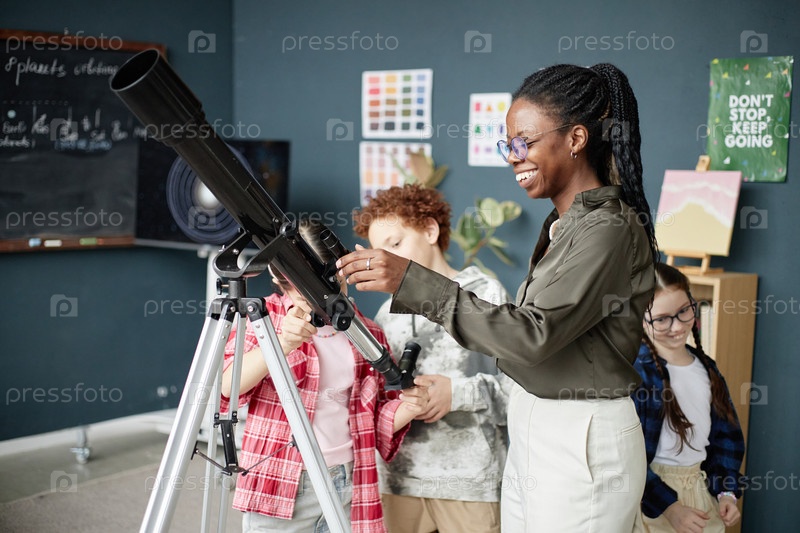 Молодая взрослая чернокожая женщина обучает разных детей с помощью телескопа в помещении