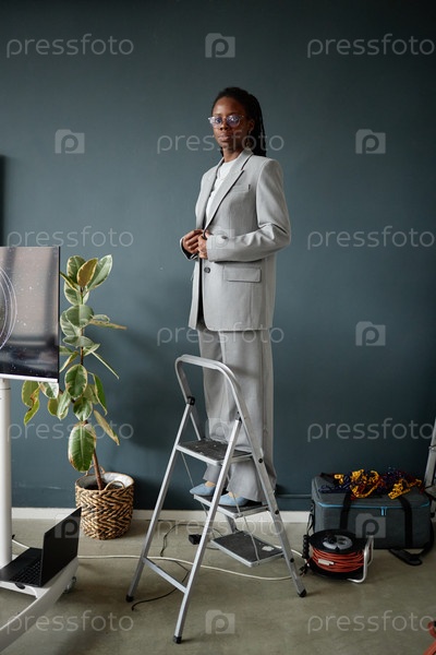 Молодая взрослая чернокожая женщина, стоящая на лестнице в костюме в современном офисе