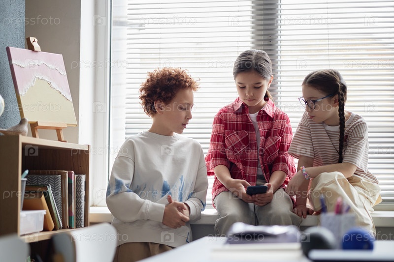 Три девятнадцатилетних ребенка, сидящих вместе и использующих смартфоны в помещении днем