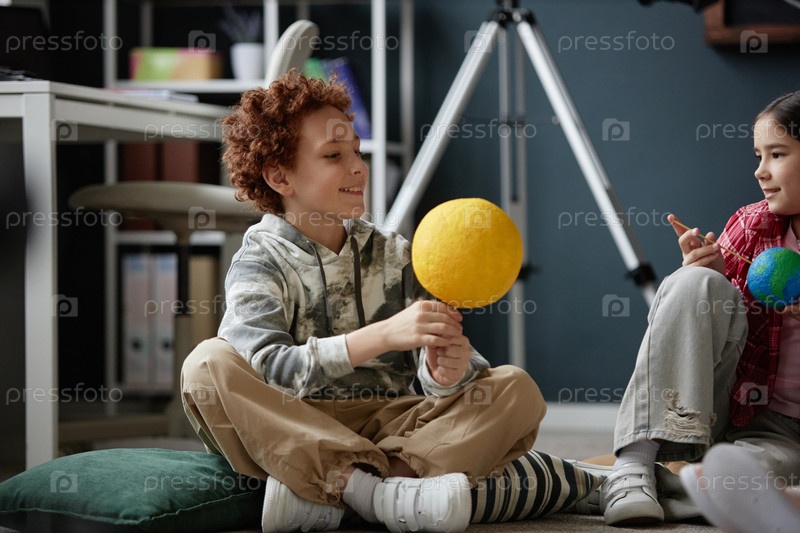 Мальчик демонстрирует модель Солнечной системы девочке во время урока науки