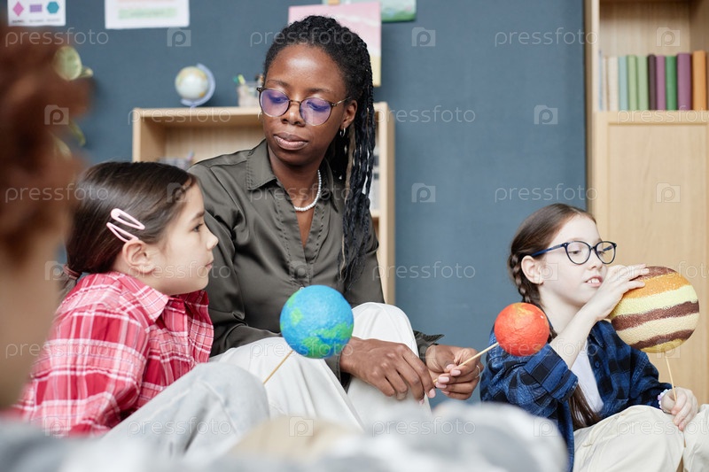 Молодая чернокожая женщина обучает разных детей моделям Солнечной системы