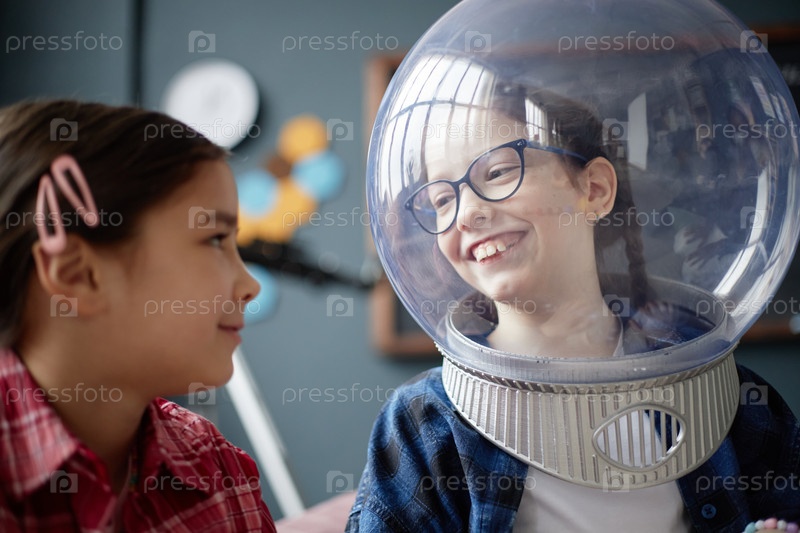 Две девушки улыбаются в помещении, а одна носит шлем астронавта