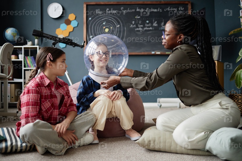 Она носит шлем астронавта, сидя с чернокожей учительницей
