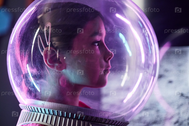 Девочка-ребенок, носящий космический костюм и шлем, воображающий исследование космоса