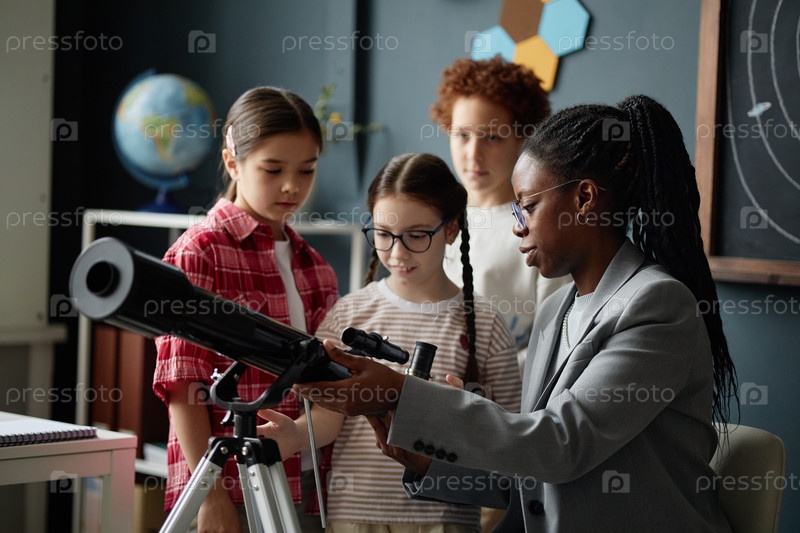 Чернокожая женщина демонстрирует работу телескопа девятнадцати студентам