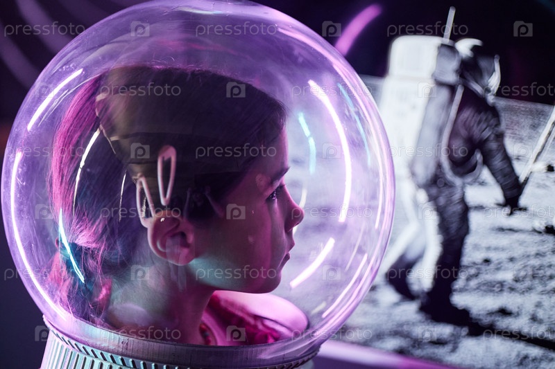 Девушка, которая носит космический шлем и наблюдает за астронавтом, идущим по Луне