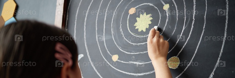 Header Image of Девочка рисует планетарные орбиты на доске во время урока наук