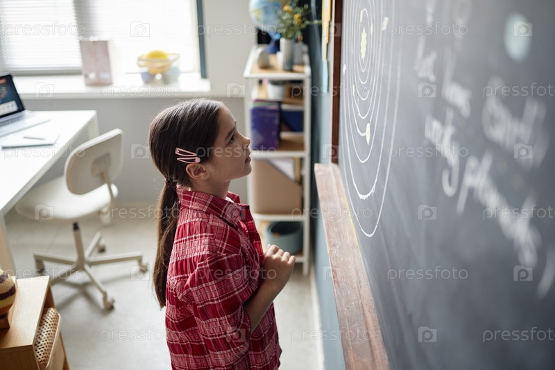 Девочка-ребенок изучает схему Солнечной системы на доске обучения в классе