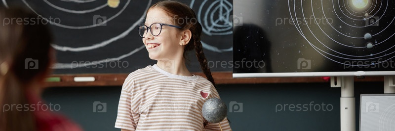 Header Image of Улыбающаяся девочка, представляющая Солнечную систему в классе