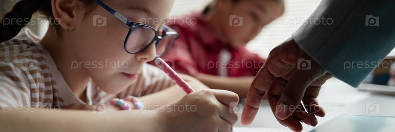 Header Image of Девушка пишет в классе, пока чернокожий учитель направляет