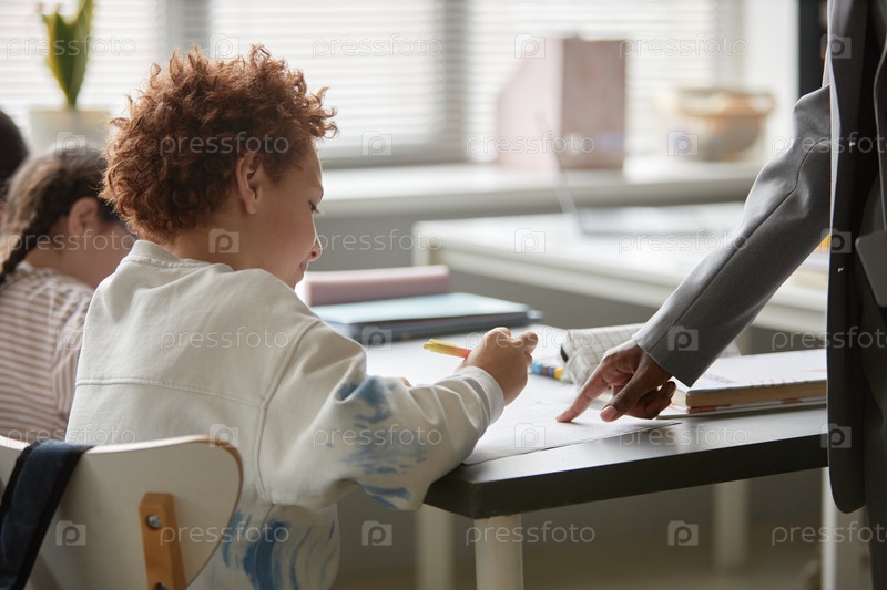 Мальчик в подростковом возрасте получает руководство от учителя во время учебы в классе
