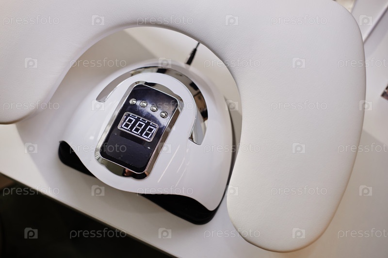 Профессиональная лампа сушилки ногтей, расположенная на столе с отдыхом рук в салоне красоты