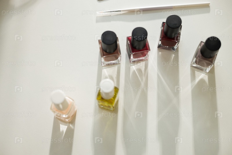 Разнообразные бутылки с лаком для ногтей, отбрасывающие тени на поверхности стола
