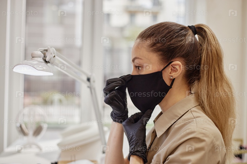 Молодая взрослая женщина, носящая защитную маску и регулирующую покрытие лица