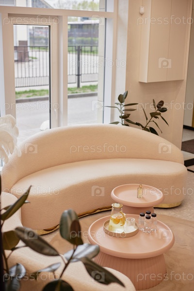 Пустой современный зал ожидания с изогнутым диваном и столом для перекусов