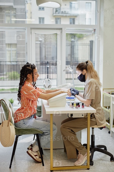 Молодая взрослая женщина дает маникюр молодой взрослой бирациальной женщине в помещении