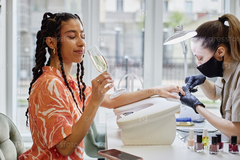 Молодая взрослая женщина отдыхает, получая маникюр в салон ногтей