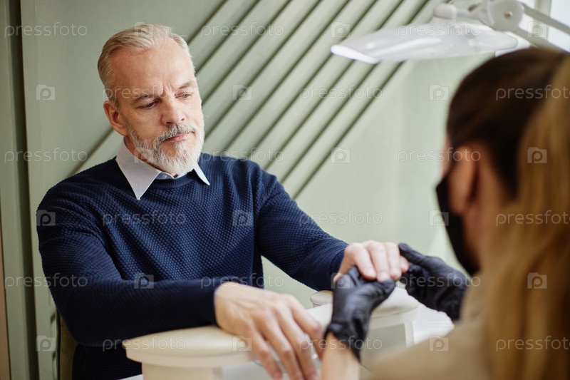 Мужчина средних лет получает маникюр от молодой женщины в салоне