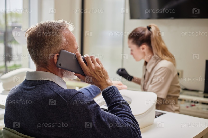 Пожилой мужчина разговаривает по телефону во время сеанса лечения ногтей