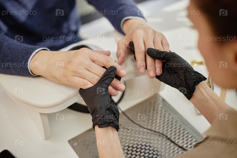 Мужчина средних лет получает маникюр от молодой женщины в салоне