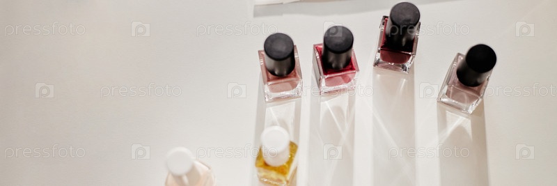 Заголовок различных бутылок лака для ногтей, расположенных на столе под ярким студийным освещением