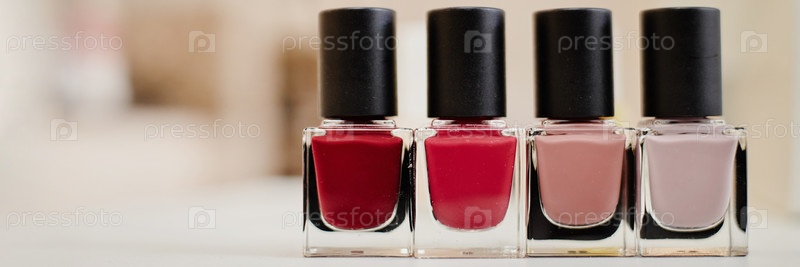 Заголовок ряда различных бутылок лака для ногтей, стоящих прямо на поверхности в помещении