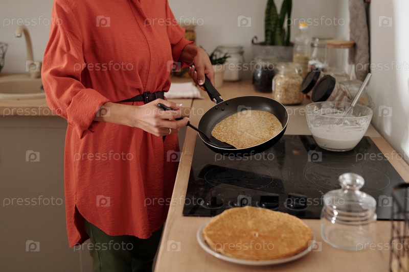 Непризнанная женщина готовит блины на утренний завтрак