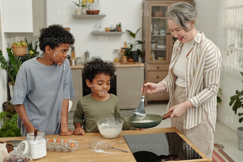 Женщина и двое детей наслаждаются приготовлением пищи