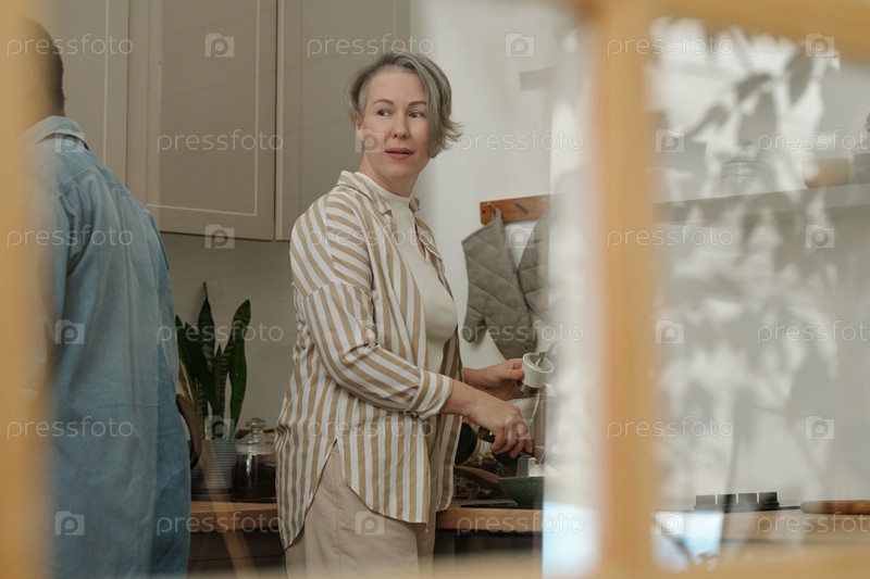 Женщина, готовящая завтрак на современной кухне с минималистическим декором