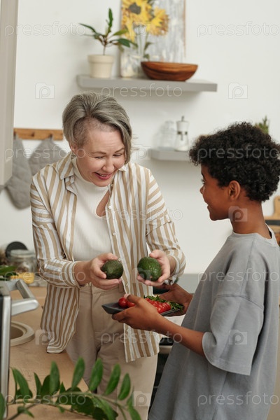 Женщина среднего возраста и мальчик взаимодействуют на домашней кухне