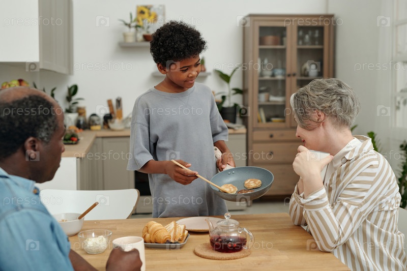 Молодой мальчик подает блины за семейным столом на завтрак