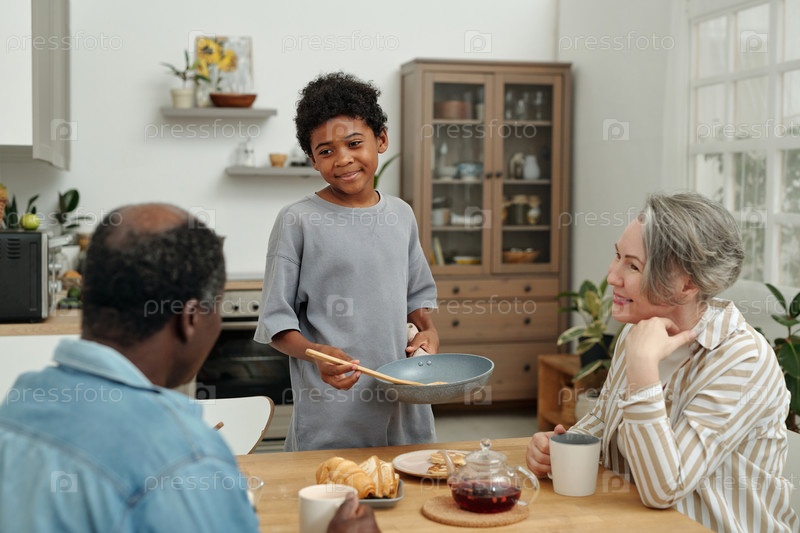 Молодой мальчик преподносит завтрак членам семьи