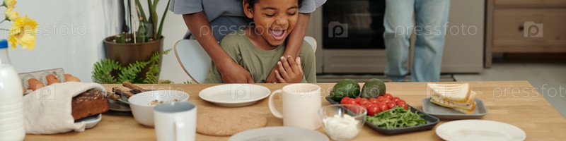 Ребенок наслаждается здоровым завтраком с семьей дома