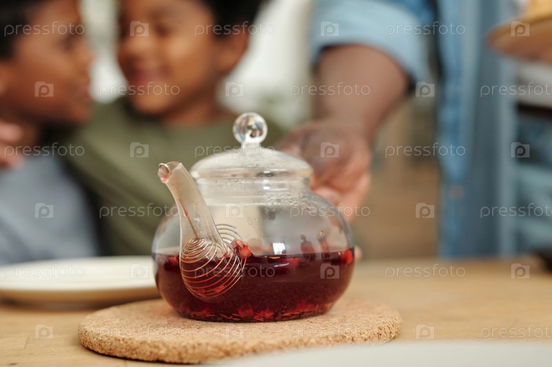 Близкий план стеклянного чайника с фруктовым чаем