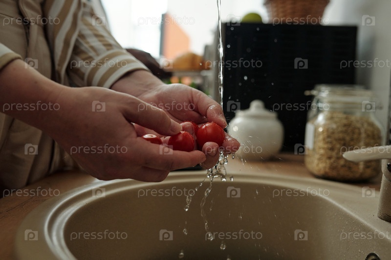 Неизвестная женщина моет помидоры в кухонной раковине