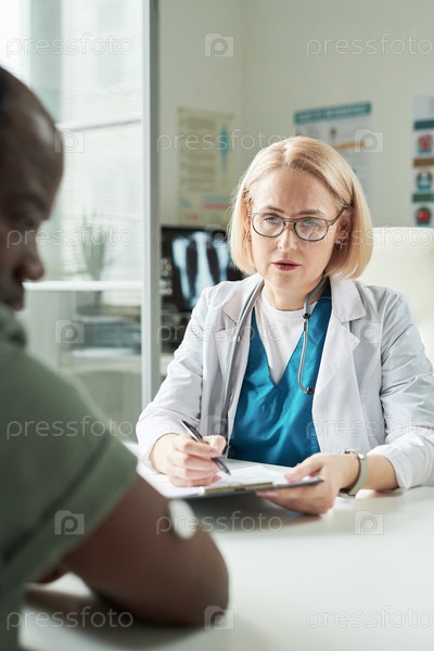 Медицинская женщина среднего возраста консультирует чернокожего мужчину с диабетом