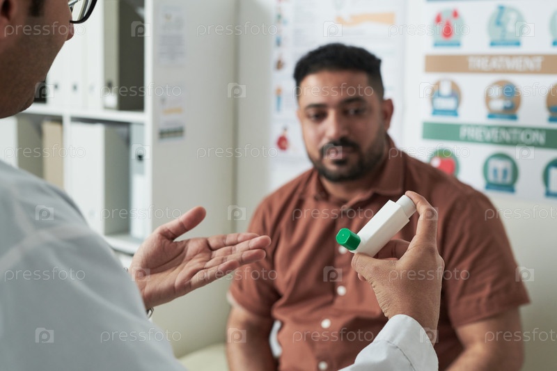 Испаноязычный мужчина средних лет получает инструкцию по ингалятору диабета в клинике
