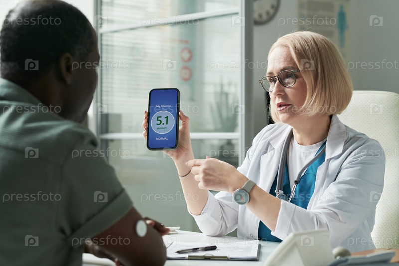 Женщина-врач среднего возраста показывает результат глюкозы черному мужчине