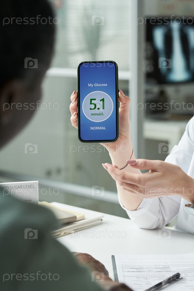 Женщина-врач показывает результат уровня глюкозы чернокожему пациенту